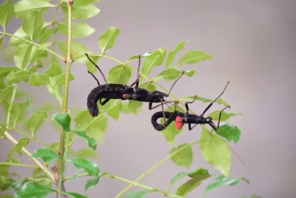 - 成體特徵:黑魔鬼竹節蟲體色為黑色,表皮軟,眼睛為金黃色,成蟲的前後翅退化成小片狀,前翅及後翅前緣一帶為黑色帶有白色細紋,後翅下半部為鮮艷的紅色,雌蟲體型略大約5公分,雄蟲約4公分。